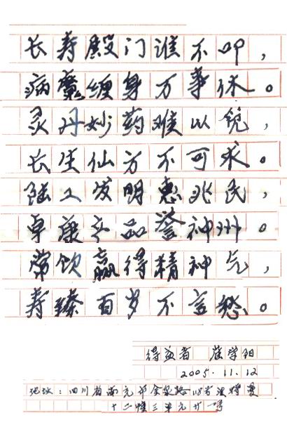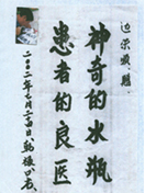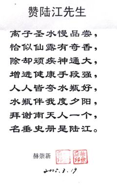 凡尊重中國(guó)古代養(yǎng)生智慧的患者,堅(jiān)持“已饑方食”和定時(shí)主動(dòng)補(bǔ)水者,均可祛病康復(fù)。如牡丹江醫(yī)學(xué)院87歲的張鵬圖飲用半年后高血壓未痊愈,陸江與他通話交流,了解他原先每日主食4兩,建議他用“已饑方食”減少主食肉食量,他理解后,將每日主食減為3兩,少吃?xún)蓧K肉,飲用一年治愈26年的冠心病和高血壓。他2003年5月31日來(lái)信說(shuō):“飲用卓康小分子團(tuán)水是根治高血壓、冠心病、糖尿病的一把金鑰匙,是填補(bǔ)醫(yī)學(xué)空白,為人類(lèi)造福,應(yīng)推廣該產(chǎn)品。”